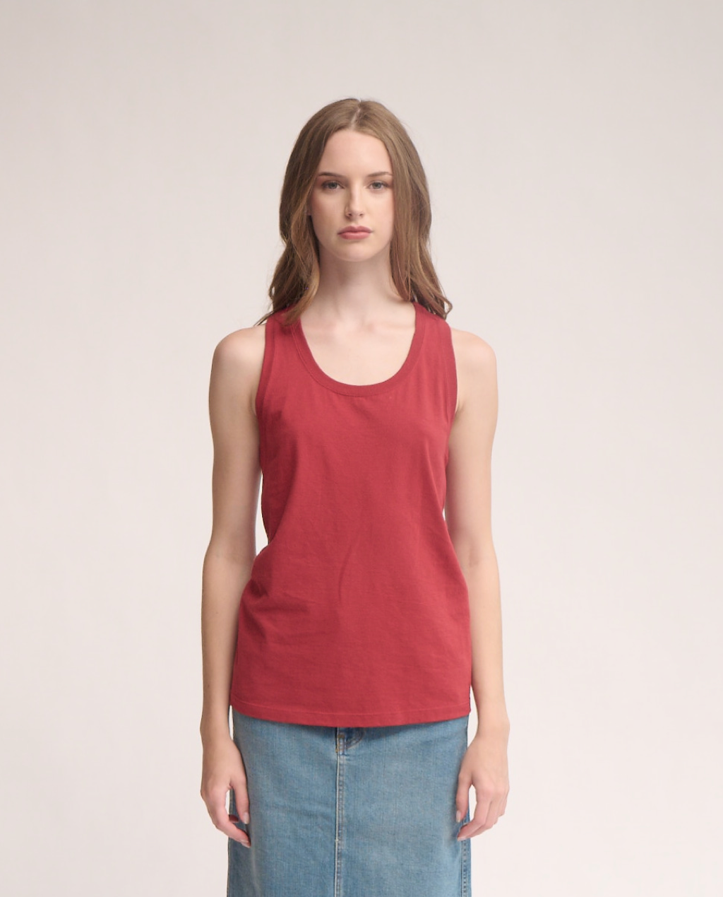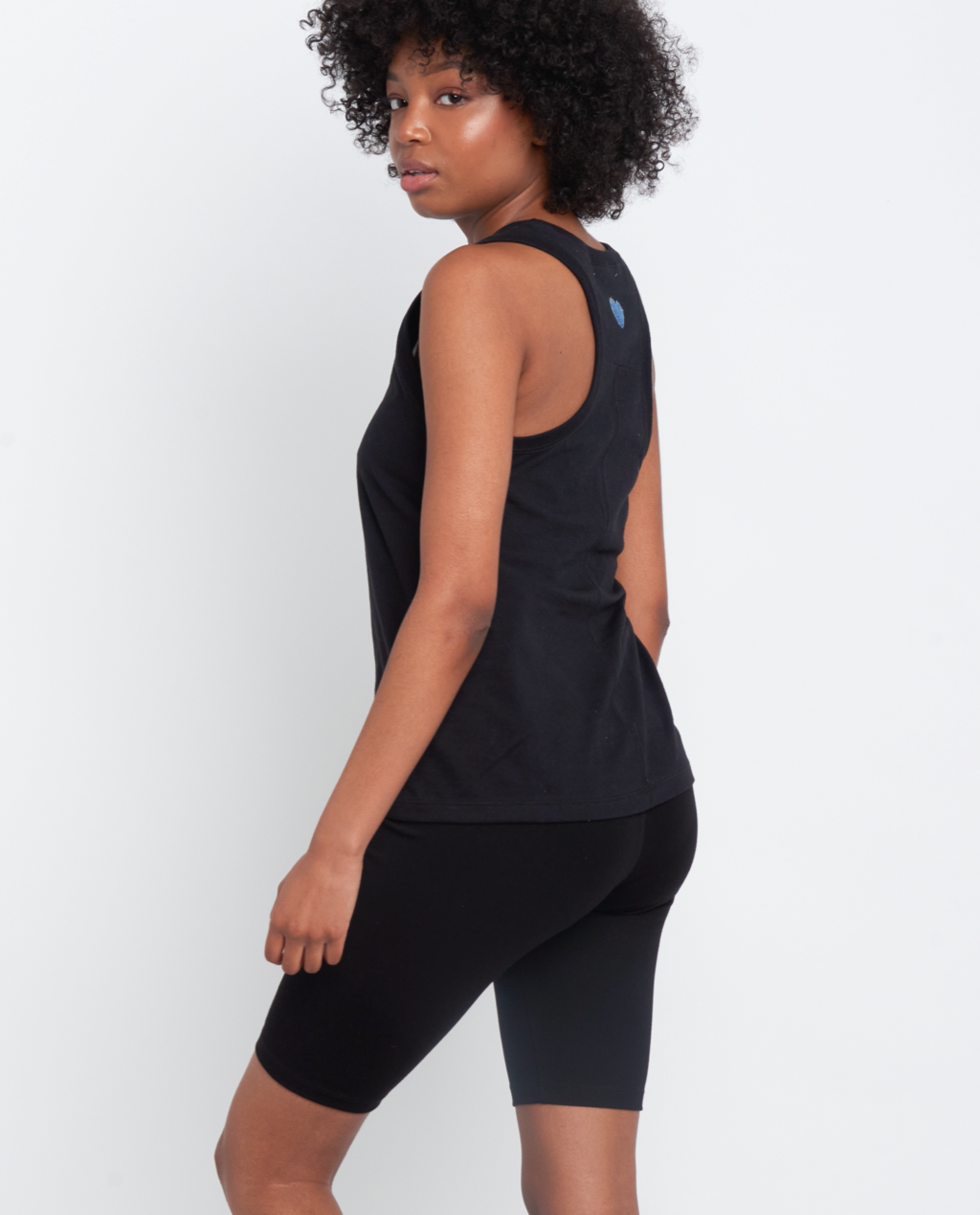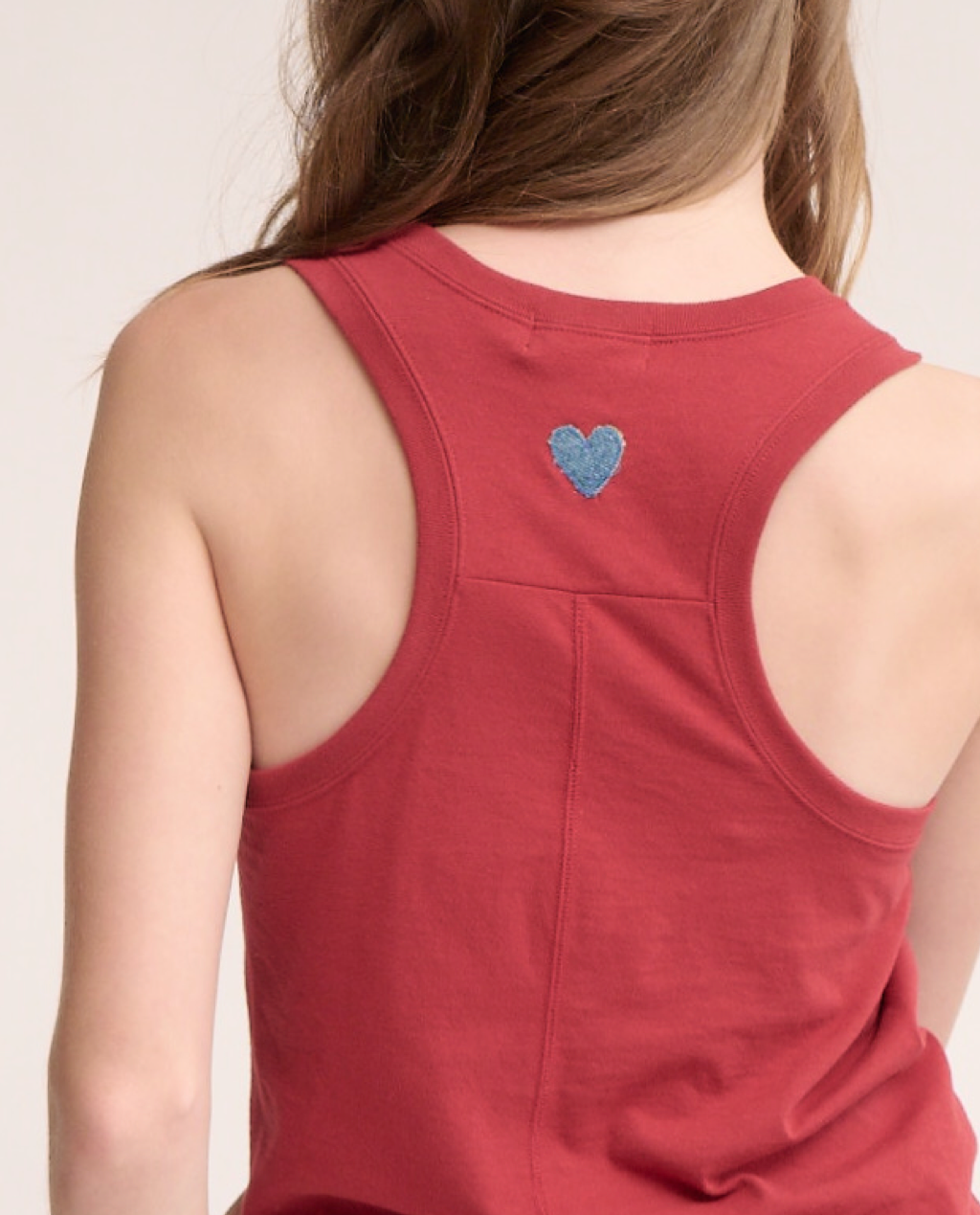 Racerback top, constructed from 100% cotton jersey - inside yoke made with upcycled striped tee and features upcycled denim heart appliqué.